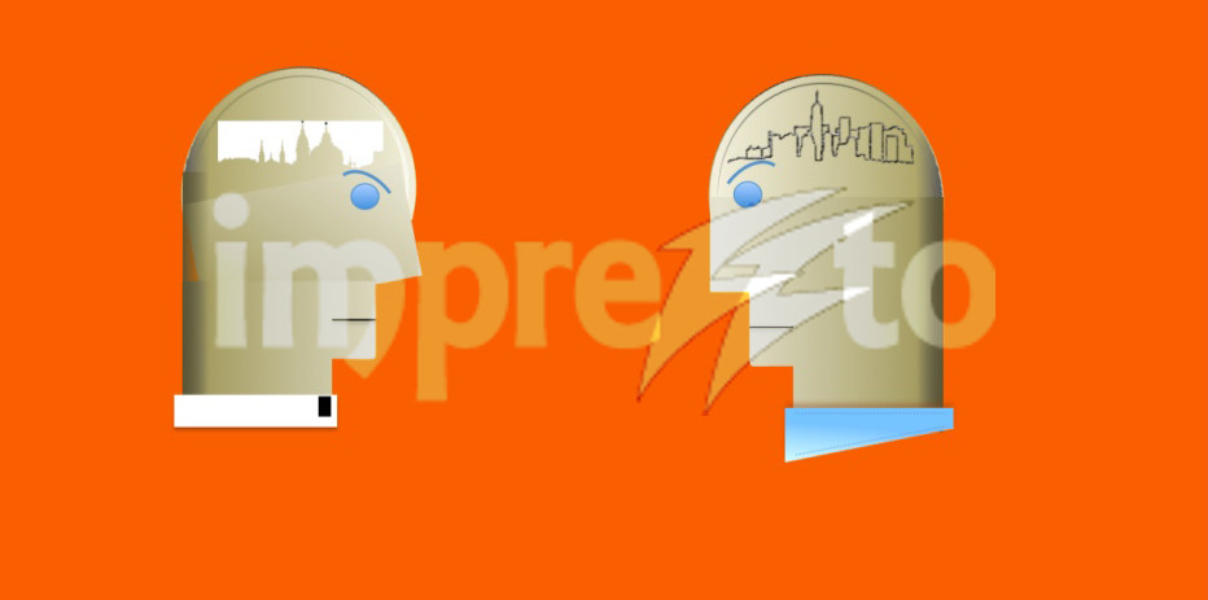 Created in powerpoint also using scanned cutouts of cityscapes. The off center snow globe heads face each other but are not facing off.